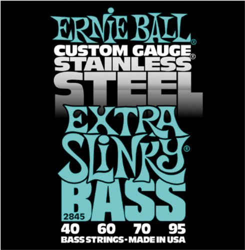 Gauges 40-60-70-95.Ernie Ball 2845 Extra Slinky Bass Strings Made from stainless steel wire wrapped around tin plated hex shaped steel core wire. These strings provide brighter sound and extra string life.The list of endorsers for Ernie Ball Slinky bass strings reads like a who's who of modern rock bass. Made in the USA with specially formulated alloys for long life and maximum vibrancy.Ernie Ball is the pioneer of rock and roll guitar strings. Jimmy Page, Eric Clapton, Steve Vai, and Slash are among the long list of Slinky players.